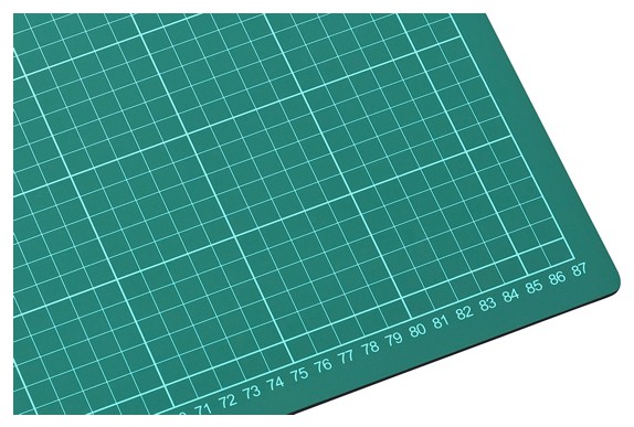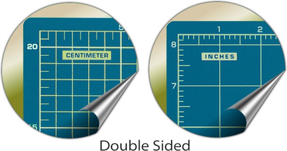 Double-sided with green base color and white grid lines with a metric grid on one side and an inch grid on the other. Grid lines are designed for easy measuring and for accurate cutting of straight lines and precise angles.
