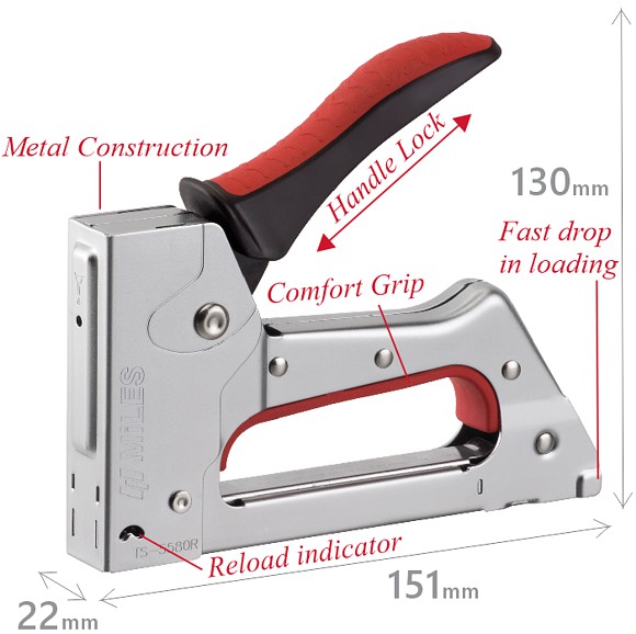 All metal robust construction. Compact design with no loose part. Easy drop-in loading with reload indicator. Handle lock for easy storage. Elegant soft rubber grip for extra working comfort.