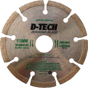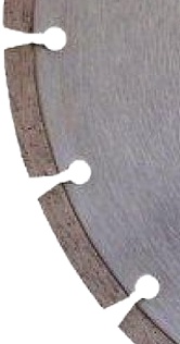 The segmented diamond blade is also known as a dry cut blade and is mostly used on dry cutting applications. Air flow cools the blade by making use of segments and cut-outs (gullets) in the body of the blade to dissipate heat.